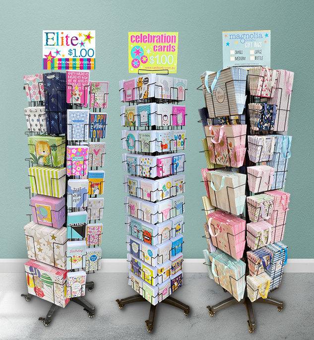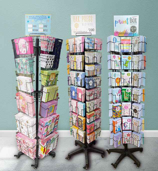 With quality, style, and maximising retail floor space being our top priority, we have designed display spinners for your every need. From slim, stylish designs that do not take up much floorspace, to large displays that will hold every occasion imaginable, we are sure to have something that suits your needs. We have displays for all product from $1, $2, $3+ premium greeting cards, to multiple price points of gift bags and wrapping paper.