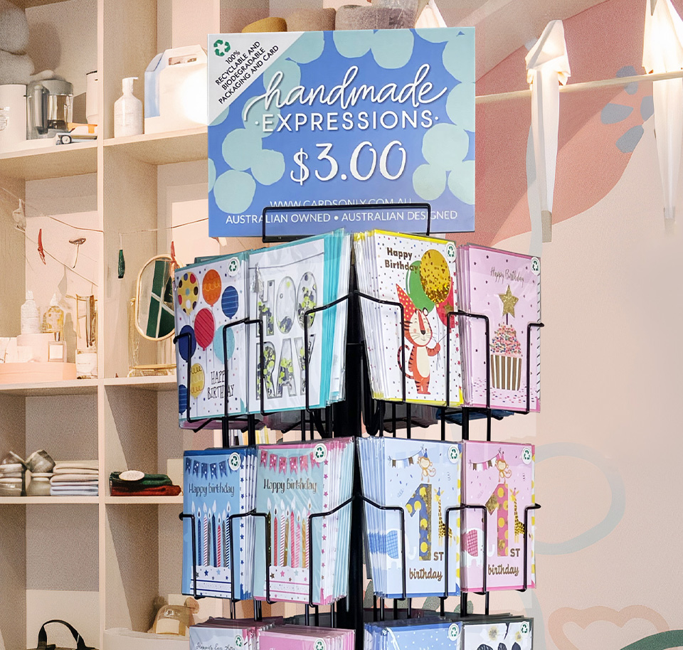 With quality, style, and maximising retail floor space being our top priority, we have designed display spinners for your every need. From slim, stylish designs that do not take up much floorspace, to large displays that will hold every occasion imaginable, we are sure to have something that suits your needs. We have displays for all product from $1, $2, $3+ premium greeting cards, to multiple price points of gift bags and wrapping paper.