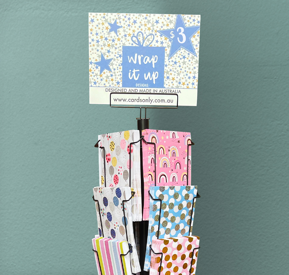 This range comes displayed in a streamlined spinner holding 36 designs. Each design comes with 10 sheets of wrap per pack. Each sheet is 685 x 500mm (172 x 250mm folded).